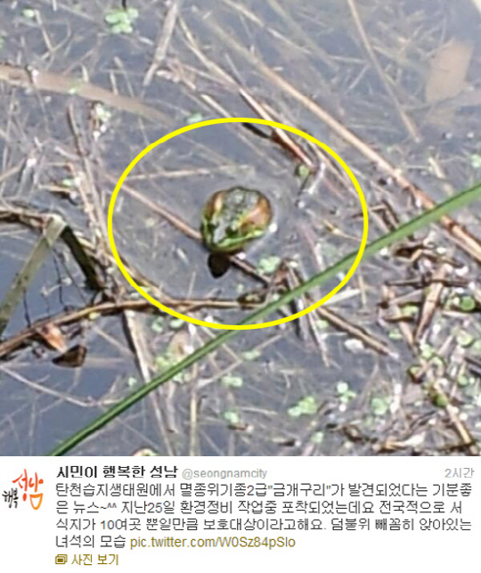 31일 성남시는 운영 중인 공식 트위터를 통해 "탄천습지생태원에서 멸종위기종 2급 '금개구리'가 발견되었다는 기분좋은 뉴스. 지난 25일 환경정비 작업 중 포착되었는데요. 전국적으로 서식지가 10여 곳 뿐일 만큼 보호대상이라고해요. 덤불 위에 빠끔히 앉아있는 녀석의 모습"이라는 글과 함께 한 장의 사진을 게재했다.