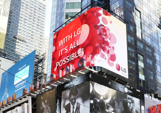 LG전자는 1일 '잇츠 올 파서블' 테마와 '레드 서클'을 적용한 브랜드 광고 영상을 뉴욕 타임스퀘어 전광판에 상영함으로써 글로벌 브랜드 마케팅 강화의 신호탄을 울렸다.