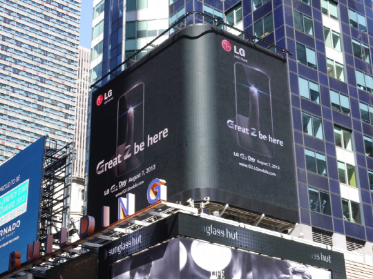 LG전자가 5일부터 미국 뉴욕 타임스퀘어에 있는 LG 전광판을 통해 신형 스마트폰 관련 'LG G2 Day' 행사 내용을 안내하고 있다. 6일부터는 영국 런던 피카딜리 광장에 있는 LG 전광판에서도 같은 내용이 소개된다. LG G2' 글로벌 런칭 행사는 7일 뉴욕 센트럴파크 인근 '재즈 앳 링컨 센터(Frederick P. Rose Hall, Home of Jazz at Lincoln Center)'에서 열린다. LG전자가 미국 뉴욕에서 스마트폰 신제품을 공개하는 것은 이번이 처음이다. 사진 제공=LG전자