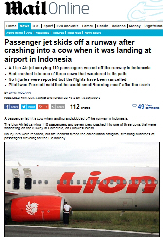 여객기가 착륙도중 소를 치고 활주로를 이탈하는 아찔한 사고가 발생했다.