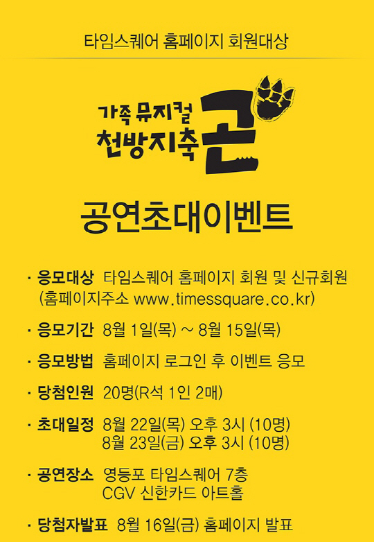 이벤트 참여 방법은 타임스퀘어 홈페이지에 로그인 후 8월 문화이벤트 페이지의 응모하기 버튼을 누르면 된다. 이벤트 응모 참가자 중 20명을 선정해 초대한다.