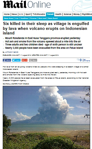 인도네시아에서 10일(현지시간) 화산이 폭발해 주민 6명이 사망했다.