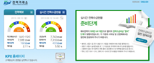 전력수급경보는 준비(500만kw미만), 관심(400만kw미만), 주의(300만kw미만), 경계(200만kw미만), 심각(100만kw미만) 등 5단계로 나뉜다.