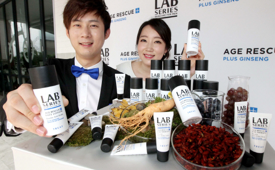 랩 시리즈남성 스킨케어 브랜드 랩 시리즈(LAB SERIES)가 7일 오전 서울 신사동의 한 카페에서 인삼 성분이 배합된 안티에이징 에센스 로션 '에이지 레스큐 훼이스 로션 플러스 진생'과 아이크림 '에이지 레스큐 아이 테라피 플러스 진생'을 선보이고 있다.