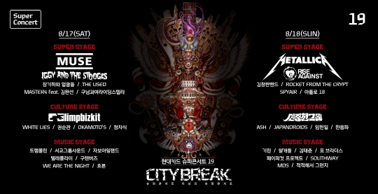 이번 <현대카드 슈퍼콘서트 19 CITYBREAK>의 가장 두드러진 특징은 압도적인 뮤지션 라인업. 이번 시티브레이크의 라인업은 음악 팬들뿐만 아니라, 페스티벌에 참가하는 세계적인 뉴 메탈 밴드 '림프 비즈킷'이 인터뷰에서 놀라움을 표시했을 정도로 강력하다.