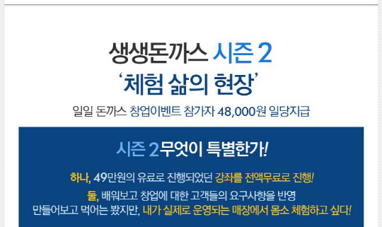 돈까스 프랜차이즈 전문기업 '생생돈까스'가 돈까스창업 관심자에 한해 매장에서 일일체험 후 일당을 지급한다. 8월 31일까지 생생돈까스 본사에서 수시접수를 받으며, 생생돈까스 영등포직영점에서 매주 화요일과 목요일 오전 11시부터 오후 7시까지 진행된다.