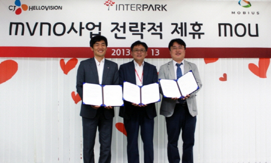 13일 오후 인터파크INT 본사 회의실에서 CJ헬로비전 M-biz추진실 김종렬 상무, 인터파크 쇼핑기획실 이태신 상무(가운데), 모비어스 강석철 대표가 MVNO 사업에 관한 전략적 제휴 마케팅 협약서에 서명한 후 기념촬영을 하고 있다.