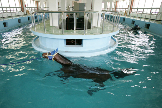 경주마들이 더위를 피하는 가장 확실한 방법은 역시 '물'이다. 경주마들은 말 전용 수영장에서 물놀이를 즐긴다. 하지만 단순한 물놀이는 아니다.