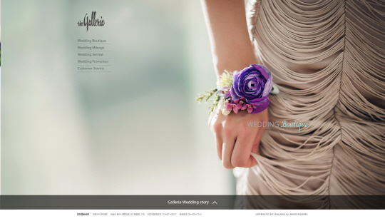 15일 갤러리아 웨딩 부티크 웹사이트(http://wedding.galleria.co.kr)를 오픈 한다. 갤러리아 웨딩 부티크 웹사이트에서는 갤러리아 웨딩 마일리지와 웨딩 시즌 동안 진행되는 다양한 이벤트 내용들을 한 눈에 확인 할 수 있다. 특히 웹사이트 오픈을 기념하여 10월 13일(일)까지 웨딩 웹사이트를 통해 웨딩 상담을 신청한 후 갤러리아 웨딩 마일리지에 가입한 고객에게는 갤러리아몰(www.galleria.co.kr) 구매 시 할인 혜택이 제공된다. 또한 웨딩 사진 촬영 등 웨딩 전문 업체의 특별한 혜택과 다양한 이벤트가 진행될 예정이다.