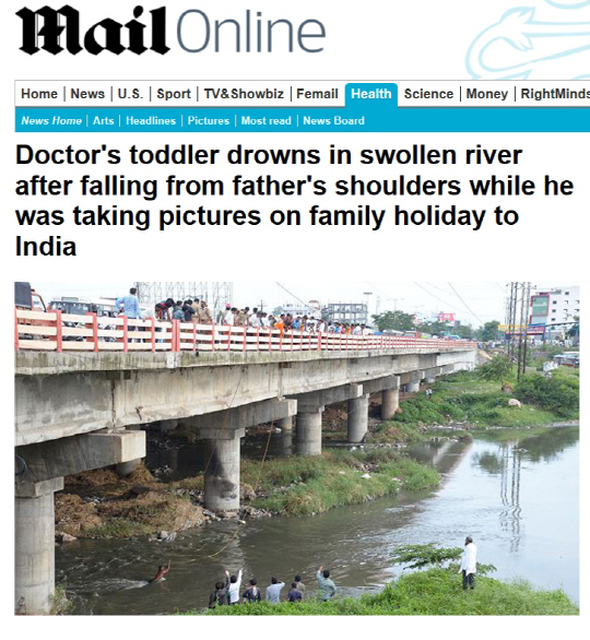 아빠의 어깨위에 걸터앉아 기념 사진 촬영하던 아기가 강물로 떨어져 숨졌다.