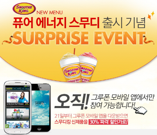 신제품 퓨어 에너지 스무디 출시를 기념해 오는 23일(금) 3일간 그루폰에서 특별 판매되는 이번 할인 쿠폰은 전국 스무디킹 모든 매장에서 사용 가능하며, 쿠폰 구매 및 사용의 편리함을 높이고자 그루폰 모바일 어플리케이션(앱)에서 구매해 즉시 사용할 수 있게 마련했다.