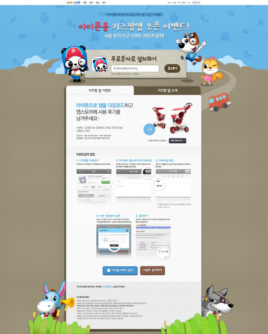다음은 아이폰용 '키즈짱' 앱 출시를 기념해 오는 9월 1일까지 이벤트를 진행한다. 아이튠즈 앱스토어에서 '다음 키즈짱' 앱을 다운로드 받고 이용후기를 남기면 추첨을 통해 총 5명에게 스마트 트라이크 자전거를 증정한다. 자세한 내용은 이벤트 페이지(http://kids.daum.net/kids/do/mobileApp/event/1)를 통해 확인할 수 있다