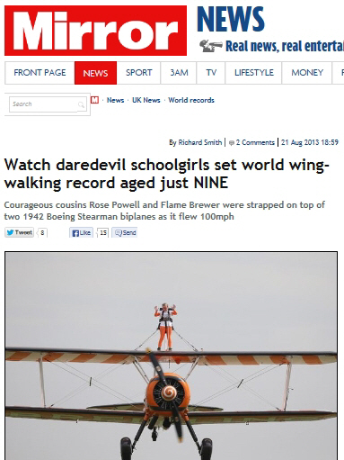 영국의 아홉 살짜리 소녀 두 명이 '비행기 날개 곡예사' 세계 최연소 기록을 세웠다.