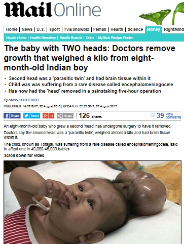 현지 의료진은 "아이의 머리위에 붙은 혹은 기생 쌍둥이로 무게가 1kg에 달하며, 그 안에 뇌 조직이 있는 상태였다"고 밝혔다.