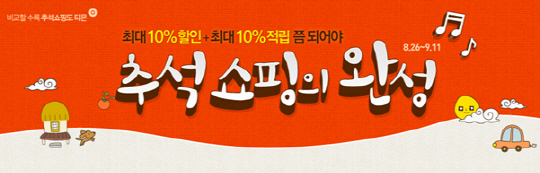 소셜커머스 티몬(www.tmon.co.kr)은 민족의 대명절 추석을 맞이해 업계 최고 혜택인 최대 10% 할인쿠폰과 최대 10% 적립을 동시에 제공하는 '추석 쇼핑의 완성' 기획전을 26일부터 다음달 11일까지 진행한다.