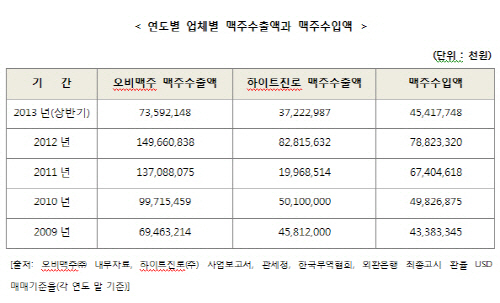 업계에 따르면 2013년 상반기 해외맥주 수입액은 3천 9백만 달러에 그친 반면 오비맥주의 맥주수출은 6천 6백만 달러, 하이트진로는 3천 3백만 달러를 돌파하며 해외맥주 수입액을 압도했다.