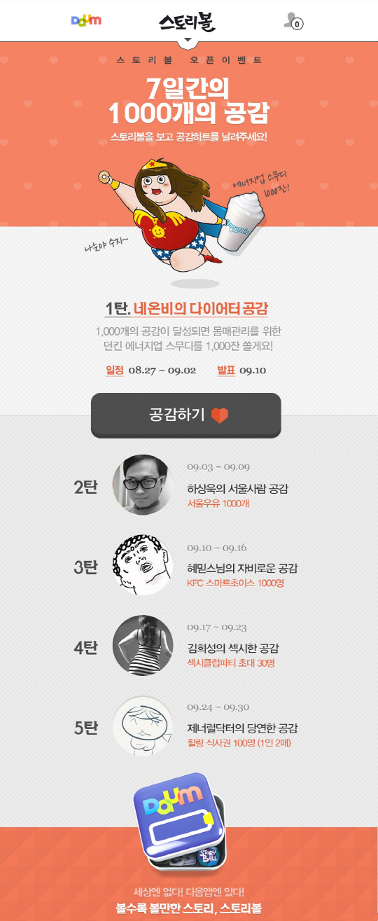 8월 27일부터 1주일 단위로 미리 정해진 5개의 연재가 공감 천 개를 달성하면, 다음은 공감 버튼을 누른 사용자 전체를 대상으로 연재와 관련된 선물을 증정할 예정이다. 이벤트 1탄으로 '네온비의 다이어터'가 천 개의 공감을 달성하면 던킨 에너지업 스무디 1,000잔을 공감한 사용자에게 모두에게 준다.