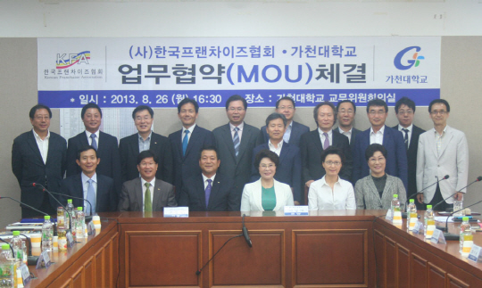 한국프랜차이즈협회가 26일 가천대학교 국제어학원 7층에서 한국프랜차이즈협회 조동민 회장, 한상만 상근부회장, 서민교 산학협력단장과 가천대학교 이길여 총장, 조효숙 부총장 등 관계자들이 참석한 가운데 산학협력식을 체결하고 9월부터 글로벌 프랜차이즈학 석사 과정을 개설, 운영키로 했다.