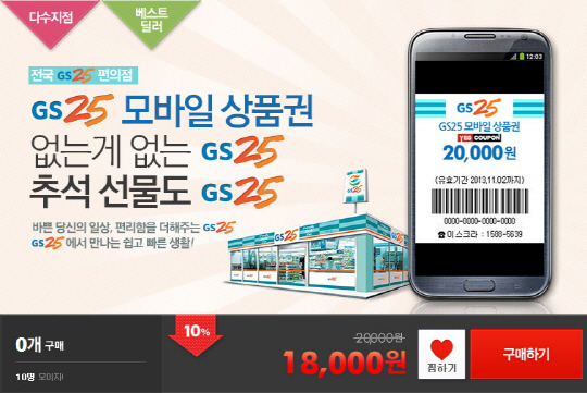 GS리테일이 운영하는 GS25는 다음 달 1일까지 소셜커머스 업체 위메이크프라이스(이후 위메프)와 손잡고 2만원권 GS25 모바일 상품권을 1만8천원에 판매한다.