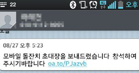 돌잔치 문자사기 소식에 네티즌들은 "돌잔치 문자사기, 선량한 사람들 돈 빼가는 나쁜 인간들", "돌잔치 문자사기, 지인들 번호로 도미노 식으로 피라미드 식으로 퍼진다는게 더 무섭다", "돌잔치 문자사기, 클릭하지 않고 바로 지우는게 답" 등 반응을 보이고 있다. <스포츠조선닷컴>