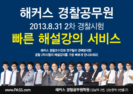 해커스 패스닷컴 경찰공무원(www.PASS.com)이 31일 치러지는 2차 경찰공무원 필기시험의 합격 여부를 가늠할 수 있는 '시험 당일 빠른 해설강의 서비스'를 오픈한다. 시험 직후인 오후 2시 해커스 경찰공무원 사이트를 통해 가답안과 무료 해설강의가 사이버경찰청 사이트보다 빠르게 제공될 예정이다.