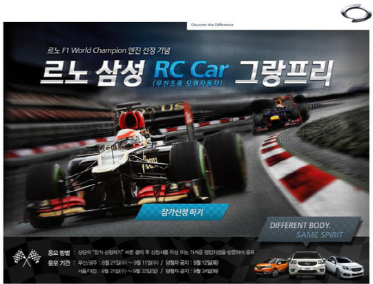 르노삼성자동차는 F1 코리아 그랑프리 개최를 즈음하여 F1 4개팀에 엔진을 공급하는 르노의 첨단 F1 기술과 그 기술력을 이어받은 르노삼성의 SM5 TCE, QM3등 제품 우수성을 소개하고, 고객들에게 RC카 레이싱을 통한 즐길거리를 제공함으로써 브랜드이미지를 향상하고 고객만족도를 높이기 위해 이번 행사를 준비했다.
