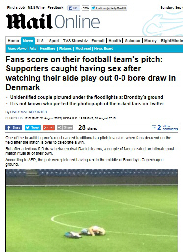 축구경기가 끝나고 관중이 떠난 그라운드에서 성관계를 갖은 커플이 휴대폰에 촬영돼 망신을 당했다.