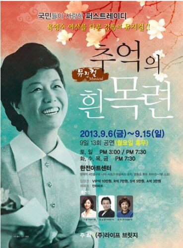 '추억의 흰 목련'은 9월 6일부터 15일까지 9일 간(월요일 제외) 서울 양재역 근처 한전아트센터에서 막이 오른다. 평일은 1회(저녁 7시), 토요일과 일요일은 각각 2회(오후 2시, 오후 7시)가 상영된다. VIP석은 10만원, R석 7만원, S석 5만원, A석 3만원이다.