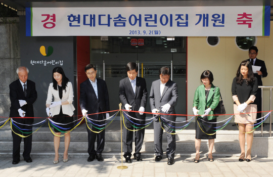 현대중공업이 2일 서울 계동사옥 '현대다솜어린이집'을 열고 테이프커팅식을 가졌다.(왼쪽에서 세 번째부터 현대중공업 김지원 부사장, 현대엔지니어링 김연일 전무, 현대건설 정희찬 상무.