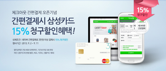 네이버 지식쇼핑은 2일, 간편결제 서비스 오픈을 기념하여 체크아웃 간편결제 서비스로 3만원 이상 구매하는 삼성카드 고객에게 15%의 청구할인 혜택을 제공하는 '네이버 체크아웃 간편결제 15% 청구할인' 프로모션을 진행한다고 밝혔다.