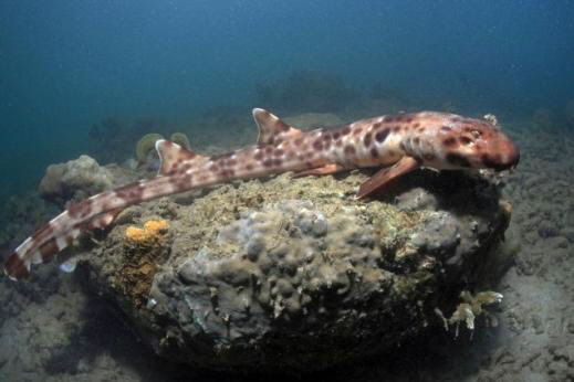'헤미실리움 할마헤라'(Hemiscyllium halmahera)라고 불리는 이 상어는 갈색 몸통에 진한 갈색 얼룩을 가지고 있다. 얼룩 사이에는 흰색 반점이 있으며 약 70cm까지 자라며, 주식으로는 바다에 사는 무척추동물이나 작은 물고기 등이며, 바다에서 헤엄치기보다는 몸통과 지느러미를 이용해 꿈틀거리며 바닥을 따라 기어 다닌다고 알려져있다.