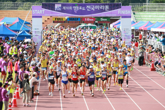 영동군이 주최한 제10회 영동포도 전국마라톤이 1일 영동군 군민운동장에서 성황리에 열렸다. 올해 대회는 외지 참가자들이 크게 늘며 지난해보다 800여명의 달림이들이 더 참여, 명실공히 대한민국 명품-인기마라톤으로 우뚝서는 계기가 됐다.