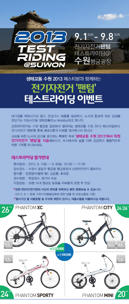 삼천리자전거(www.samchuly.co.kr)가 오는 8일까지 '생태교통 수원 2013'에 참여해 전기자전거 '팬텀' 체험 라이딩 이벤트를 가진다.