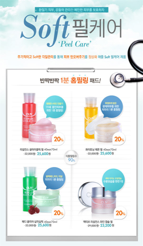 이밖에도 CL4(씨엘포) 공식 쇼핑몰 (www.cl4.co.kr)에서는 환절기 속 예민한 피부를 보호해주고 피부 타입에 따라 골라 사용할 수 있는 소프트한 필케어 제품(리설전스 글라이콜릭 필 /화이트닝 레몬 필/메디 클리어 살리실릭 필40ea×70ml_32,000원)과 수분 젤의 보습과 오일의 영양을 동시에 선사하는 액티브 리설전스 와인 캡슐 젤(50ml_29,000원)을 20%할인 된 가격으로 만나볼 수 있다.