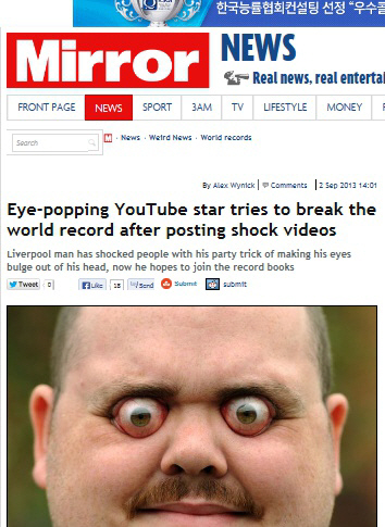 그는 "2년전 처음 이 묘기를 배워 친구들에게 보여주자 놀라워했다"며 "현재 안구를 약 12밀리미터 밖으로 튀어나오게 할 수 있다"고 주장했다.