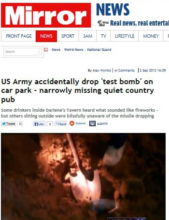 2일(현지시간) 영국매체 미러는 미국 메릴랜드주 방위군 소속 전투기에서 훈련용 폭탄이 투하돼 술집 주차장에 떨어졌다고 전했다.