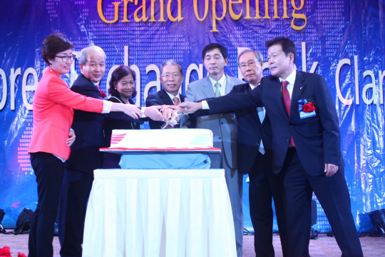 4일 필리핀에 진출한 유일한 한국계 은행으로 마닐라에 이어 두번째 로 클락지점을 개설한 외환은행은 클락 위더스호텔 컨벤션센터에서 개점행사를 갖고 참석한 귀빈들과 함께 개점 축하 케?揚 커팅하고 있다.사진 왼쪽부터 김희경 필리핀 한국부인회장, 이장일 필리핀 한인총연합회장, 베티 크리스틴 부니 필리핀 중앙은행 이사, 윤용로 외환은행장, 이 혁 필리핀 대사, 이수신 한진중공업홀딩스 사장, 이상배 외환은행 클락지점장.
