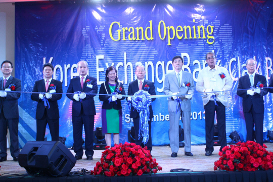 일 필리핀에 진출한 유일한 한국계 은행으로 마닐라에 이어 두번째 로 클락지점을 개설한 외환은행은 클락 위더스호텔 컨벤션센터에서 개점행사를 갖고 참석한 귀빈들과 함께 개점 축하 테이프 커팅을 하고 있다.