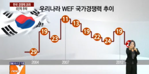 WEF가 집계한 우리나라의 국가경쟁력은 2007년 11위로 최고 순위를 기록한 이후 2012년 24위에서 19위로 오른 것을 제외하고 해마다 하향곡선을 그리고 있다.