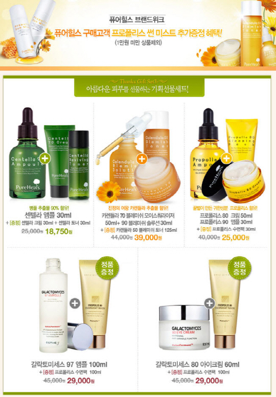 이 밖에도 추석선물 기획전으로 손상된 피부의 힘을 키워주는 센텔라아시아티카 90% 함유 퓨어힐스 센텔라 앰플(30ml_25,000원), 진정 효과가 뛰어난 카렌듈라 추출물을 함유하여 피부 자극을 완화하는 퓨어힐스 카렌듈라 90 블레미쉬 솔루션(30ml_19,000원)+퓨어힐스 카렌듈라 70 블레미쉬 모이스춰라이저(50ml_22,000원), 꿀벌이 만든 귀한 성분 프로폴리스추출물을 함유한 퓨어힐스 프로폴리스 90 앰플(30ml_20,000원)+퓨어힐스 프로폴리스 80 크림(50ml_21,000원)을 구매하면 최대 50% 할인 및 추가 정품을 증정하는 이벤트도 진행한다.