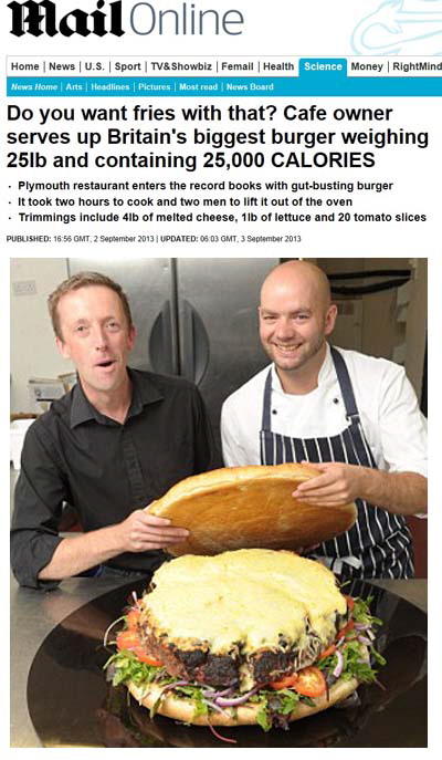 이 버거는 20인치(약 50cm) 빵에 4파운드의 치즈, 엄청난 크기의 고기, 20개의 슬라이스 토마토, 1파운드의 샐러드가 재료로 사용됐으며 열량이 2만5000칼로리에 달하는 것으로 알려졌다.