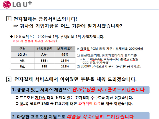 호소문의 내용 중 사실과 맞는 게 하나도 없다는 것이다. LG유플러스 관계자는 "KG모빌리언스의 주장은 사실과 다르다"며 "저가 수수료 영업과 저가 덤핑으로 가맹점 영업을 한 적이 없다"고 날선 감정을 내비쳤다. 그는 오히려 "최근 KG모빌리언스가 독점해온 이베이 결제시스템 입찰에서 함께 사업을 하게 된 상황에서 골목상권을 침해한 듯 보이게 하려는 의도"라며 "1997년부터 사업을 해왔던 만큼 상생에 어긋나는 일을 한 적이 없다"고 말했다.