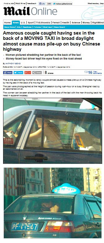택시 뒷좌석의 여성은 파트너위에 걸터앉은 모습이었고 남성의 머리는 뒤로 젖혀져 있다. 더욱 놀라운 것은 택시 운전사가 뒷좌석에서 벌어지는 일을 바라보는 일 없이 앞만 응시하고 있다는 것이다.