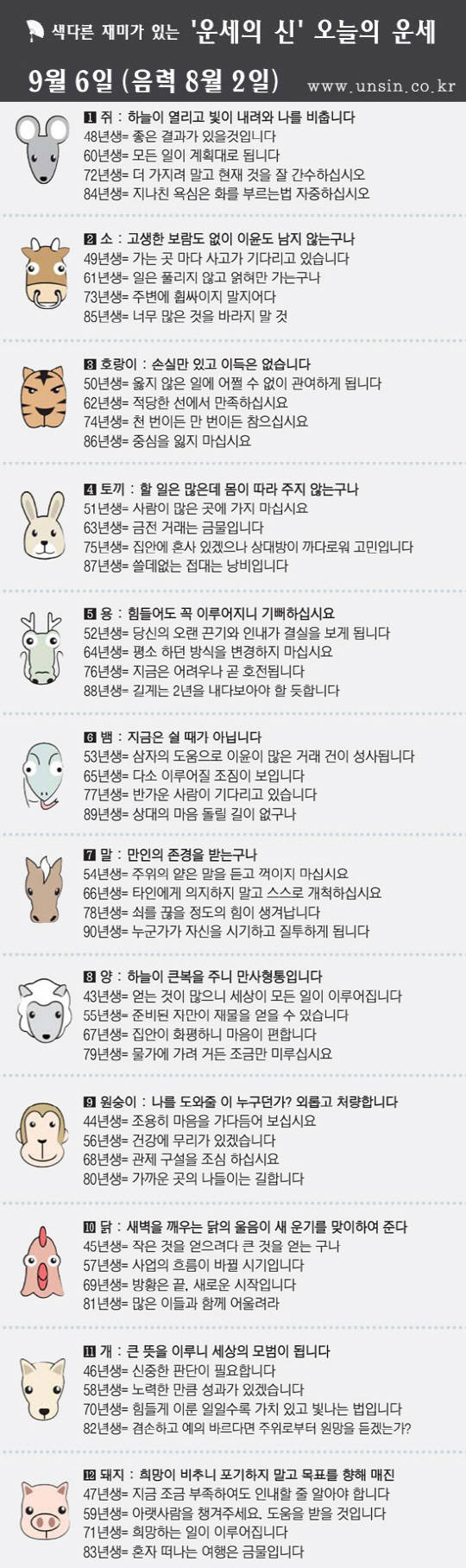 [직장인을 위한 오늘의 운세] 2013년 9월 6일 금요일(음력 8월 2일)