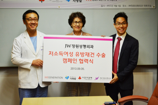 JW정원성형외과가 지난 5일 저소득 유방암 환자의 유방 재건수술을 위한 캠페인 협력식을 갖고 저소득 유방암 환자 2명에게 유방 재건수술을 약속했다.