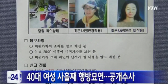앞서 강 씨는 지난 4일 오후 8시 20분께 제중국어학원에서 수업을 마치고 나온 뒤 연락이 끊겨 5일 오전 강 씨의 남편 양모 씨가 경찰에 신고하면서 경찰은 곧바로 공개수사에 들어 간 바 있다.