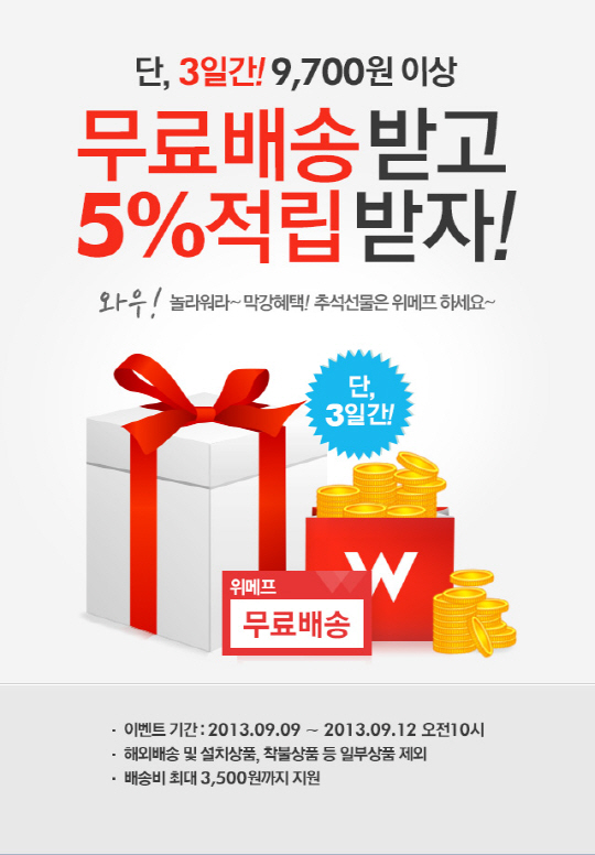 박유진 위메프 홍보실장은 "추석 시즌을 맞아 고객들에게 더 많은 혜택을 드리고자 전 배송상품 무료배송을 실시하게 되었다"며 "5% 포인트 적립, 최저가 110% 보상제 등과 같이 진행하는 이번 무료배송을 통해 고객들은 더욱 저렴한 가격으로 추석 쇼핑을 할 수 있을 것"이라고 전했다.