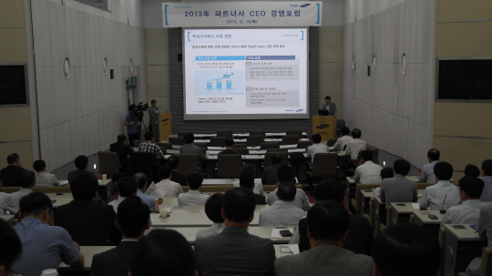 | 삼성SDS가 12일 역삼동 멀티캠퍼스에서 개최한 파트너사 CEO 경영포럼에서 삼성SDS 경영지원실장 박경정 부사장이 사업구조 혁신 내용, 파트너사 정책 방향 및 지원사항 등을 설명하고 있다. |