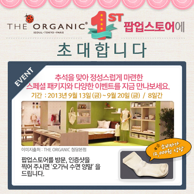 이를 위해 디오가닉은 오는 13일부터 20일까지 롯데백화점 7점에 팝업스토어를 열고 베이비, 레이디, 리빙, 침구, 목욕 등의 5가지 라이프 센스에 맞춘 해외 유수의 오가닉 브랜드을 전시, 판매한다. 이와 함께 팝업스토어 오픈 기념행사도 진행한다. 팝업스토어를 방문해 인증샷을 찍어 아이맘 사이트(www.i-mom.co.kr)에 올리면 추첨을 통해 12,000원 상당의 수면양말을 증정하는 것.