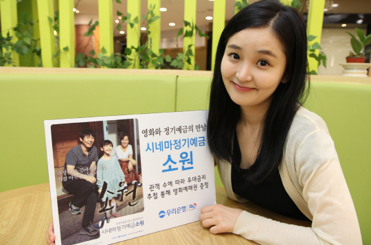 우리은행(은행장 이순우)이 롯데엔터테인먼트와 공동마케팅 협약을 맺고 영화 관객수에 따라 우대금리를 제공하는 시네마정기예금 '소원'을 9월 16일부터 10월 11일까지 판매한다.